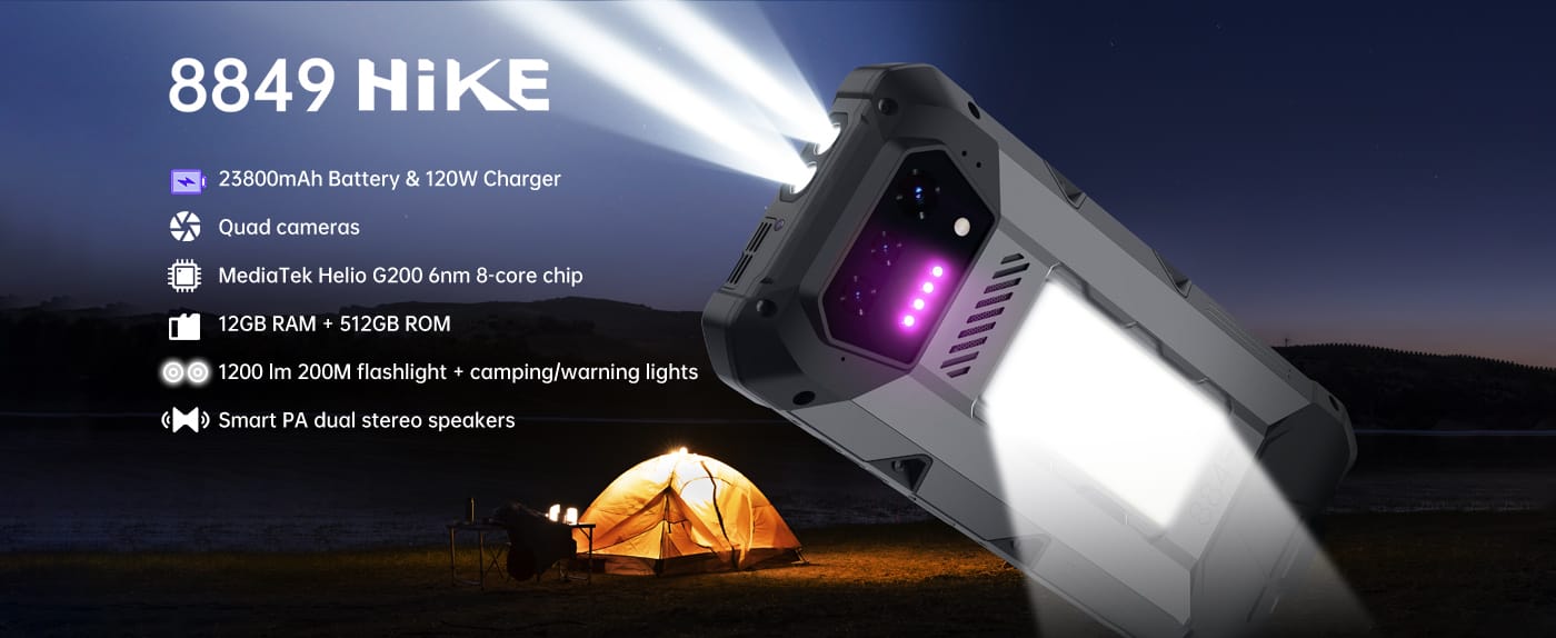 8849 HIKE: The World's First Rugged Phone with 1200lm 200M Dual Flashlights