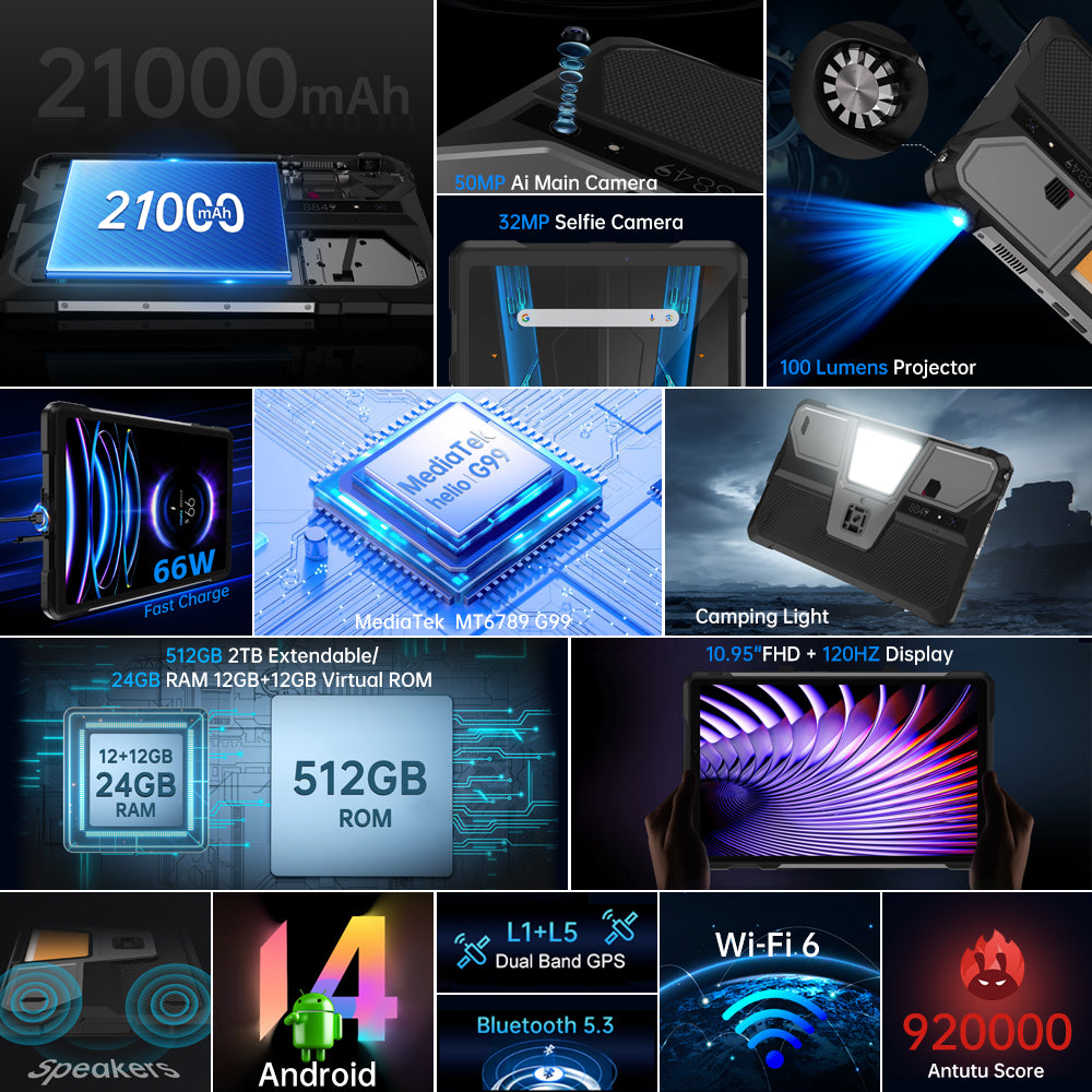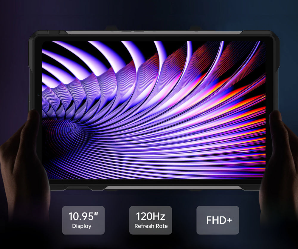8849 Tank Pad E Android 14 tablet boasts a 10.95-inch FHD+ display with a 1200×1920 resolution and 120Hz refresh rate. What's more, this 8849 tablet features a 700-nit brightness level, ensuring exceptional visibility even in direct sunlight—making it perfect for outdoor use. Whether you're reviewing documents or watching videos, its 85% screen-to-body ratio enhances your viewing experience by minimizing bezels and maximizing the screen space.