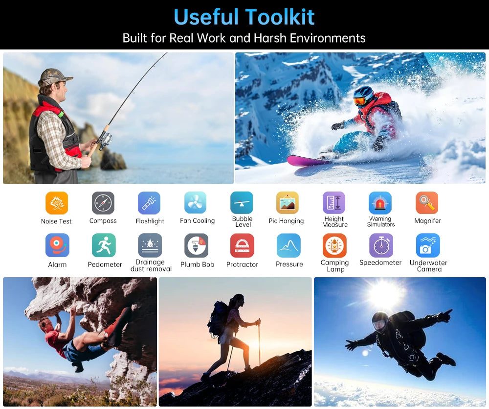 TANK X Rugged Cellphone is more than a durable device—it is a practical, all-in-one tool designed for real-world use. Equipped with a system-level Toolbox, it integrates essential functions such as a compass, flashlight, camping lamp, bubble level, plumb bob, protractor, height measurement, barometer, speedometer, magnifier, pedometer, underwater camera, noise testing, and alarm alerts. These tools are built to support outdoor exploration, construction work, equipment installation, engineering inspection, and emergency situations. Whether navigating in areas without signal, working at night, leveling or measuring on site, conducting underwater checks, or monitoring environmental conditions, TANK X reduces the need for additional equipment and improves efficiency and reliability in demanding environments.
