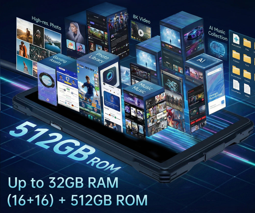Tank Pad Ultra este alimentat de chipsetul octa-core Dimensity 8200 pe 4nm, având un nucleu Cortex-A78 la 3,1GHz, trei nuclee Cortex-A78 la 3,0GHz și patru nuclee Cortex-A55 la 2,0GHz, împreună cu un GPU Mali-G610 MC6 pentru multitasking și grafică fluentă. Modemul 5G integrat oferă viteze maxime de descărcare de până la 4,67Gbps—de două ori mai mari decât cele ale Tank Pad—și suportă Wi-Fi 6 pentru o conectivitate mai rapidă și mai fiabilă în medii aglomerate. Managementul avansat al energiei asigură o durată de viață excepțională a bateriei chiar și în condiții de utilizare intensă, făcând Tank Pad Ultra pregătit pentru cele mai solicitante sarcini în aer liber și industriale.