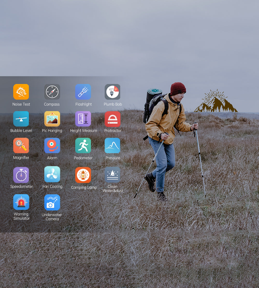 8849 Tank Pad Ultra oferă peste 20 de unelte esențiale, inclusiv test de zgomot, busolă, lanternă, nivelă cu bulă, ghid pentru agățat poze, măsurător de înălțime, lupă, alarmă, pedometru, plumb, raportor, manometru, vitezometru, cameră subacvatică, lampă de camping, curățare apă și praf, răcire cu ventilator, simulator de avertizare și super lanternă.