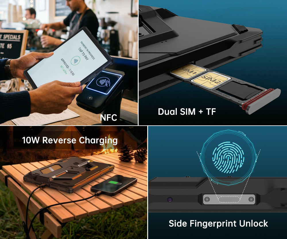 Tableta robustă Tank Pad Ultra este echipată cu NFC pentru plăți rapide și controlul accesului, suport dual SIM pentru a rămâne conectat pe mai multe rețele, un senzor lateral de amprentă pentru deblocare rapidă și sigură, și încărcare inversă pentru a alimenta alte dispozitive în mișcare—făcând-o un instrument practic atât pentru muncă, cât și pentru utilizarea zilnică, oriunde te-ai afla.