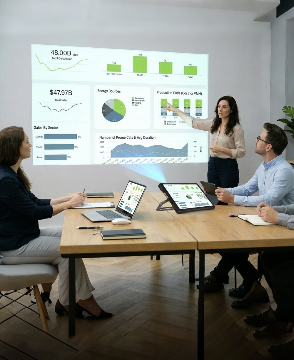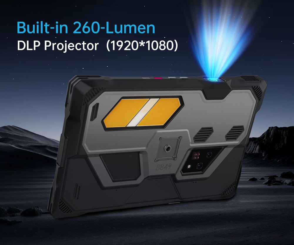 8849 Tank Pad Ultra dispune de un proiector DLP încorporat de 220 de lumeni, de două ori mai luminos decât precedentul Tank Pad, cu o rezoluție îmbunătățită de 1920×1080. Autofocalizarea oferă imagini clare de la 0,5 la 4 metri, permițând vizionarea pe ecran mare chiar și în lumina zilei. Ideal pentru prezentări pe teren, instruire la fața locului și muncă colaborativă fără ecrane externe.