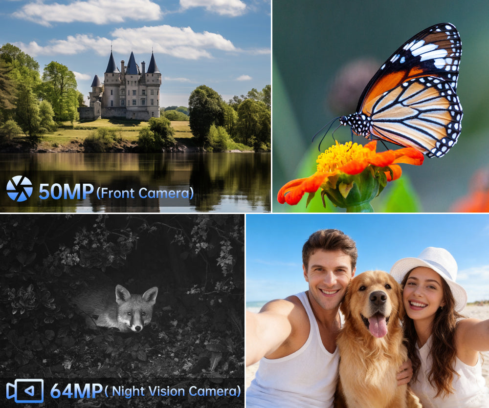 • Camere de 50MP + 32MP Față + 64MP cu Viziune Nocturnă — Capturează fotografii de calitate profesională zi și noapte, cu 4 LED-uri infraroșii pentru întuneric total.