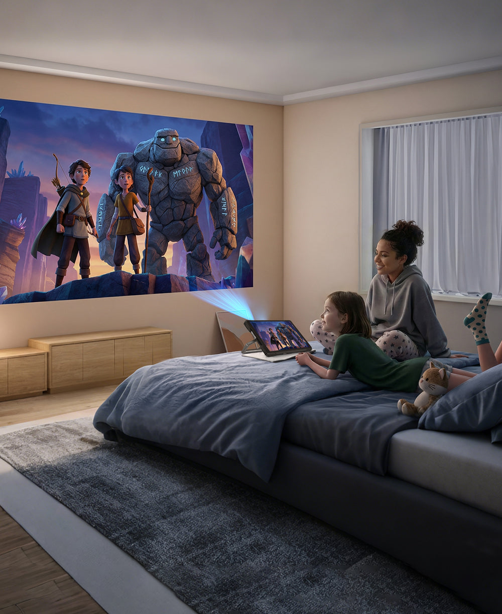 • Proiector încorporat de 260 lumeni (1920*1080) — luminozitate fără precedent, auto-focalizare, interval de focalizare 0,5–4 m, vizionare pe ecran mare chiar și în lumina zilei.