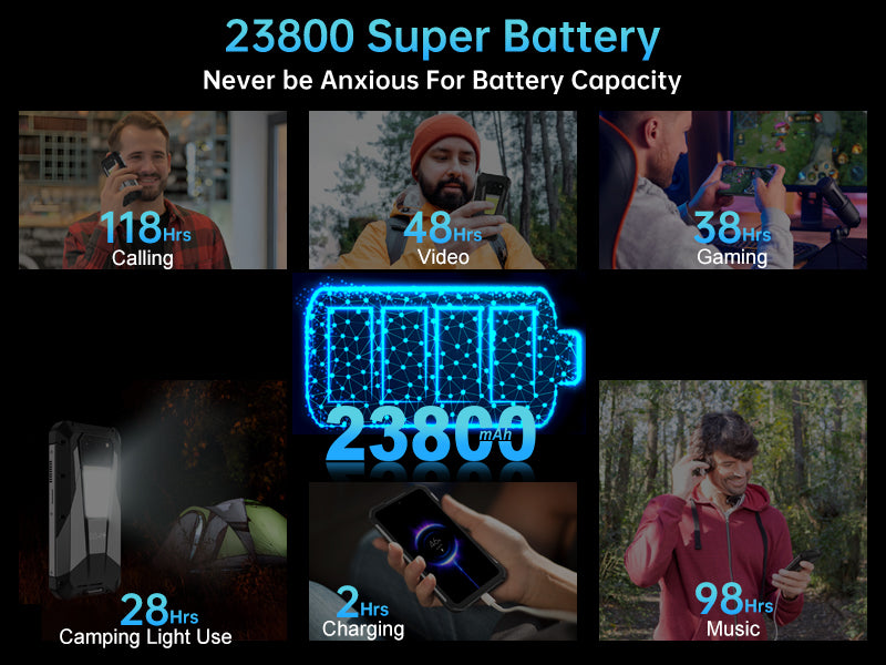 TANK 3 Pro features a 23,800mAh battery with up to 118 hours of talk time. Its dual-cell parallel-series design with 7.74V voltage delivers higher efficiency and stability. An independent coulomb counter (±1% accuracy) ensures precise battery readings and eliminates false power drops. High- and low-temperature protection enables safe use in extreme environments, from desert camping to mountain trekking. It supports 120W fast charging, reaching 90% in about 1.5 hours and a full charge in just 2 hours, plus 10W (5V2A) Type-C reverse charging for emergency power sharing.