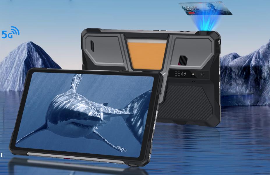 TANK Pad, the first 5G rugged tablet with a built - in projector. Great for outdoor adventurers, business pros on - the - move, and students. It has a 100 Lumens DLP projector, Dimensity 8200 CPU, 21000mAh battery with 66W fast charge, 32GB RAM, 512GB ROM expandable to 2TB, dual speakers and a camping light.