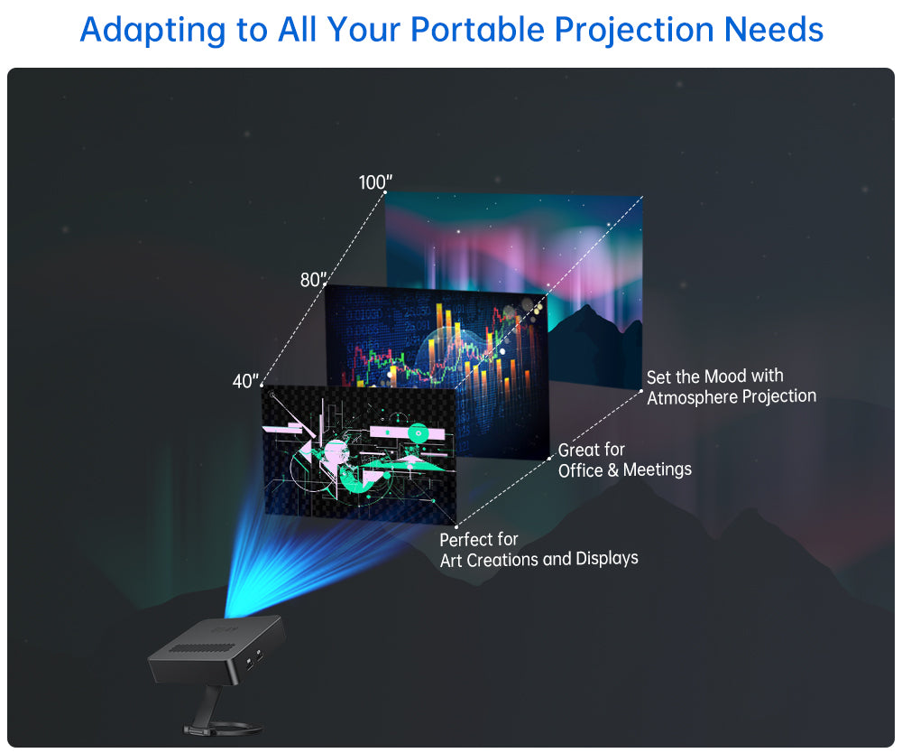 This projector offers 40" - 100" screen sizes, ideal for office meetings, art showcases, and setting ambient moods. Adaptable to diverse scenarios.