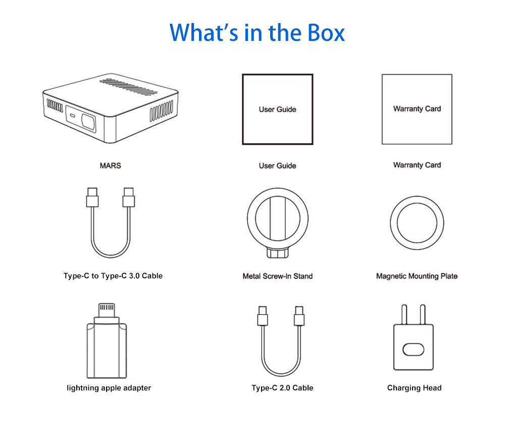 Mars Projector, User Guide, Warranty Card, Type - C to Type - C 3.0 Cable, Metal Screw - in Stand, Magnetic Mounting Plate, lightning apple adapter, Type - C 2.0 Cable, Charging Head.